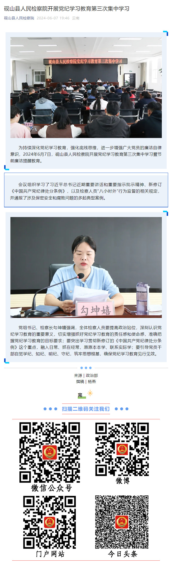 砚山县人民检察院开展党纪学习教育第三次集中学习